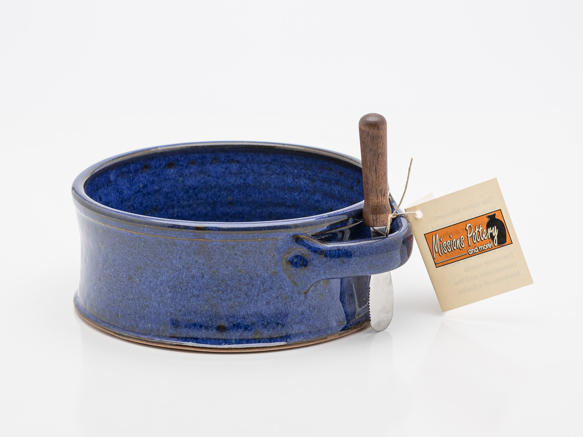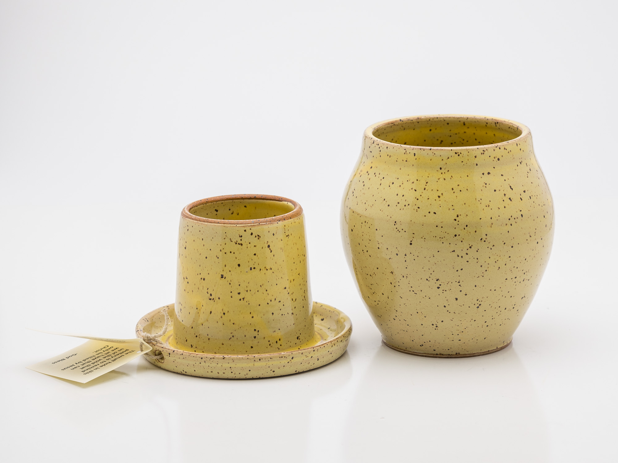 A container used to maintain the freshness and spreadable consistency of butter without refrigeration. This crock has two parts: a base that holds water (bottom), and a cup to hold the packed butter (top) which also serves as a lid.